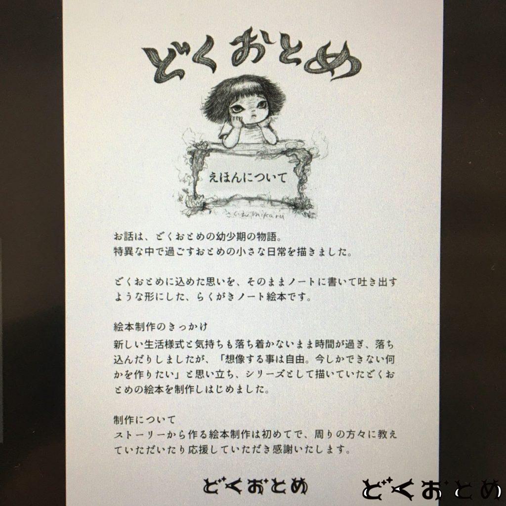 2020年6月より制作を開始し12月にデザインフェスタギャラリー原宿で「どくおとめ絵本展」個展をした後、絵本とポストカードなどグッズをファブスペースみたかにて展示販売させていただいております。