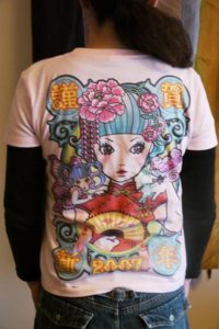 お友達のバンドと占いで活動中の推己さんに毒乙女のTシャツを注文いただきました。この2枚のイラストで背面いっぱいにイラストを入れてと注文をいただきドキドキだったのですが、大満足の仕上がりになりました。